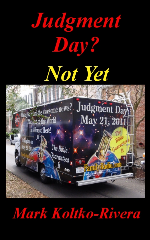 By now, most tuned-in Americans are aware of a prediction that Judgment Day will occur this coming Saturday, May 21. To be specific, Harold Camping, who broadcasts on Family Radio around the country, predicts that Judgment Day and the Rapture will occur this Saturday, and that the end of the world will occur five months later, on October 21. A number of people are taking this very seriously. Several of Camping’s followers are travelling around the country in Project Caravan (see the photo on the book cover, above), advertising these predictions. The New York Daily News and the New York Post recently reported that a local follower has spent his life savings, $140,000, to put up advertisements about the predictions on buses, subway platforms, and bus shelters around the City.